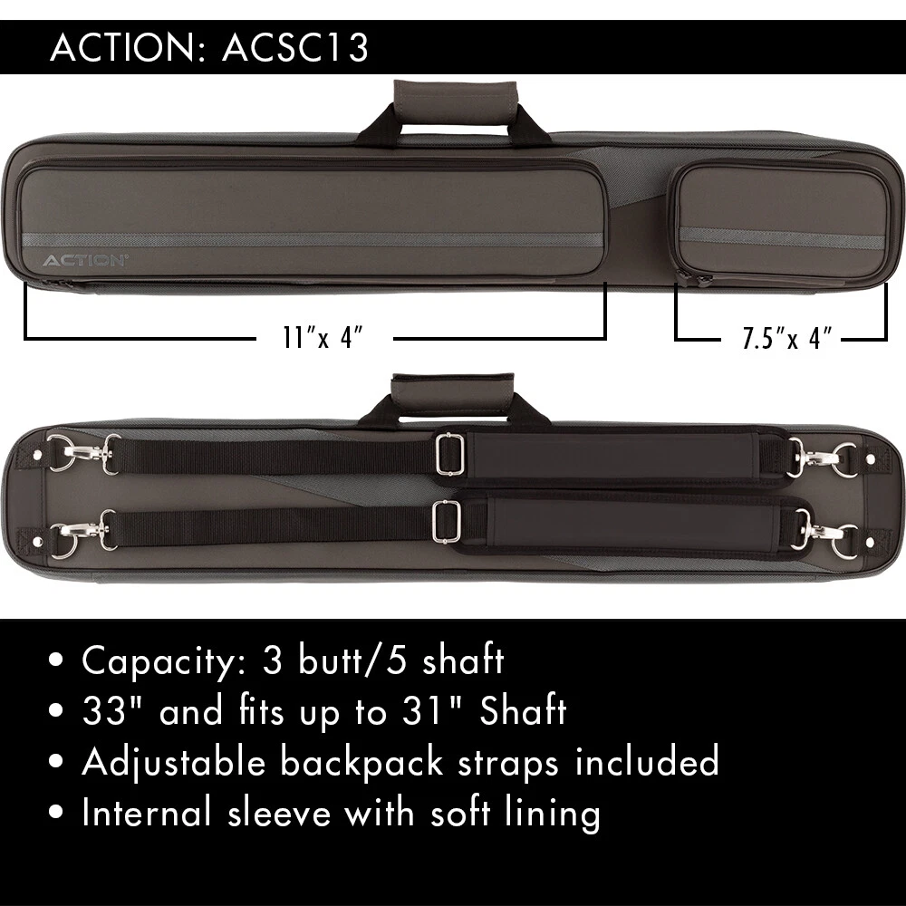 This soft case is made of vinyl and fabric accents in dark grey and light grey, giving it a quiet, functional look. It’s designed to carry three butts and five shafts, with a total length of about 34″—while the longest shaft pocket reaches 31″ and the longest internal pocket is around 20″ (with space for a jump butt and chalk).