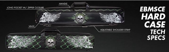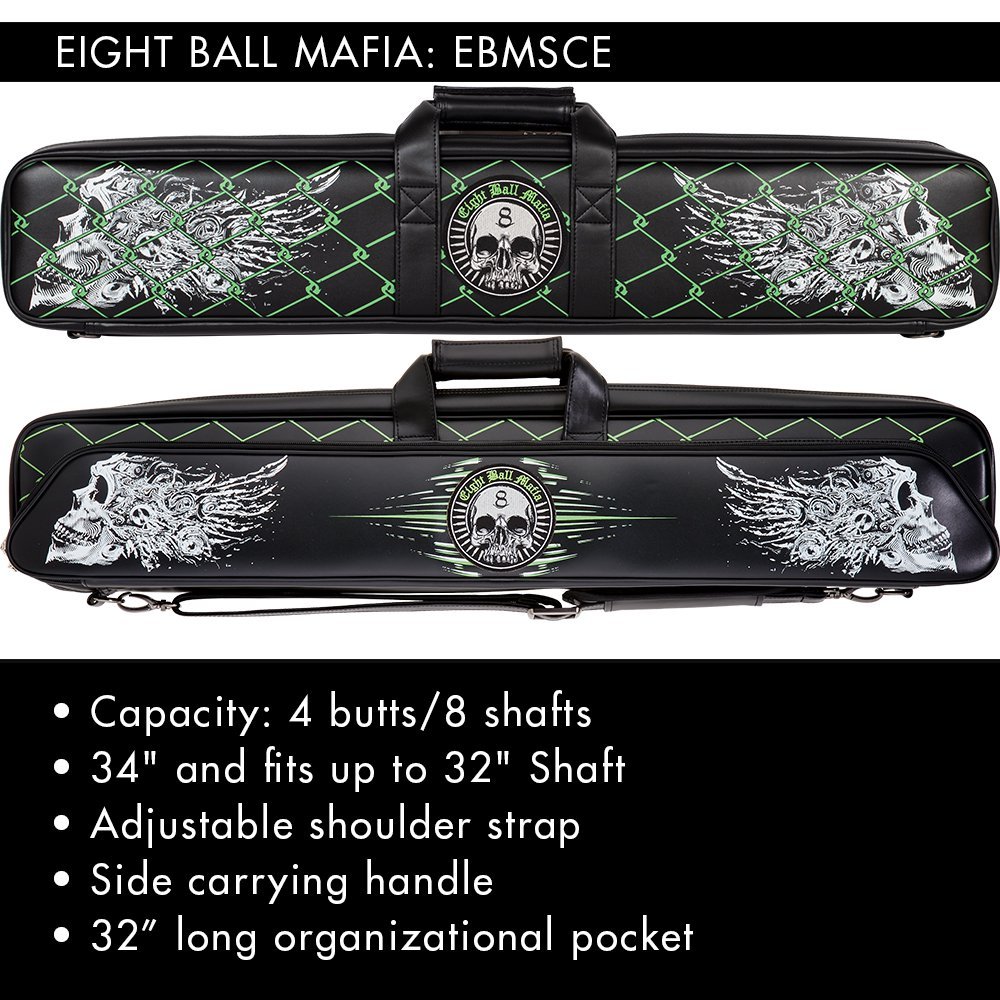 4×8 Eight Ball Mafia soft case. Crafted from black vinyl with a white and lime green skull grunge design, it holds up to 4 butts and 8 shafts with easy butterfly-style access. The large exterior pocket includes compartments for accessories and a jump butt handle, while the side handle and shoulder strap keep it easy to carry and ready for action.